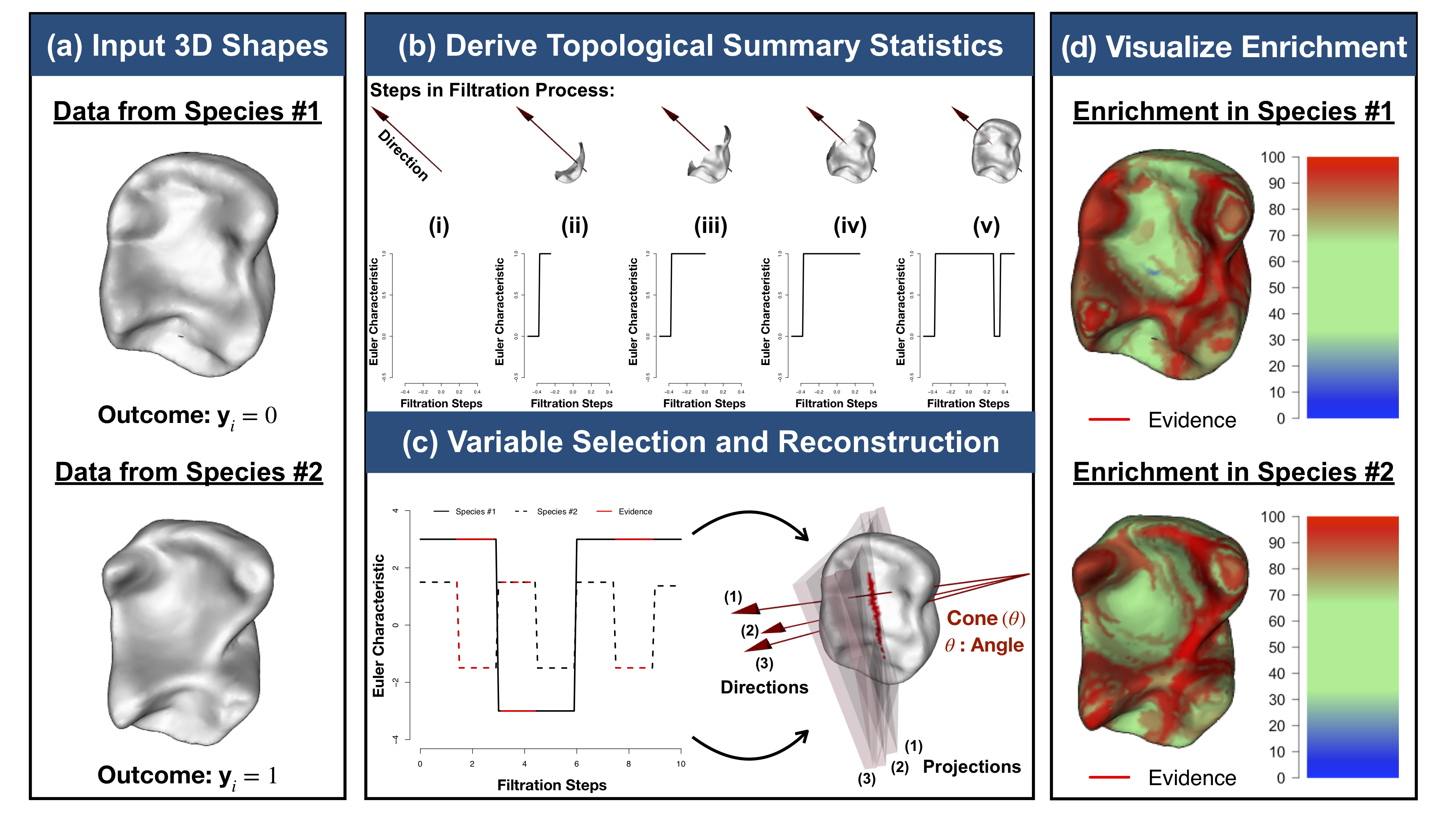 - B. Wang*, T. Sudijono*, H. Kirveslahti*, T. Gao, D.M. Boyer, S. Mukherjee†, and L. Crawford†# (2021). A statistical pipeline for identifying physical features that differentiate classes of 3D shapes. Annals of Applied Statistics. 15(2): 638-661. [PDF] [SI] [Software] [Journal Link]